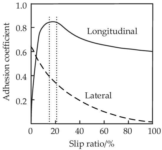 Figure 13 shows that when the slip ratio is 0.15–0.20, the longitudinal adhesion coefficient and lateral adhesion coefficient are both large, and the longitudinal force and lateral force on the tire are also sufficient, so the vehicle can maintain good dynamic performance and stability.