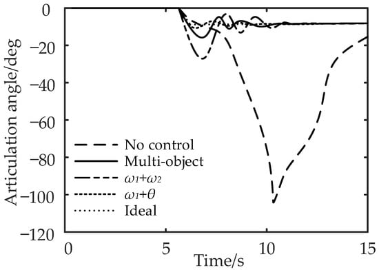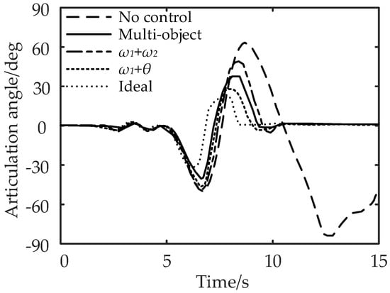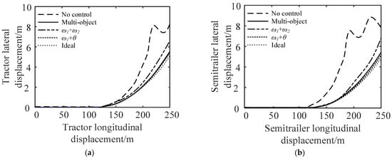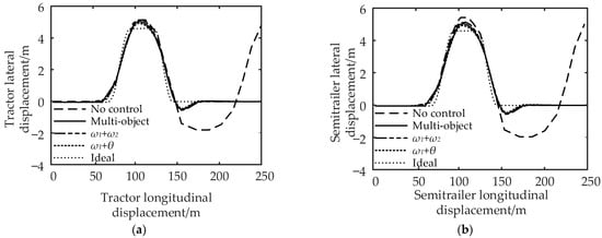 It can be seen from Figure 15 and Figure 16 that compared with no control, the maximum lateral displacement deviation of the tractor under multi-object control is reduced by 3.71%, the maximum lateral displacement deviation of the semi-trailer is reduced by 5.45%, and the maximum articulation angle is reduced by 46.67%; for control, the lateral displacement deviation of the tractor, semi-trailer, and the maximum articulation angle are reduced by 1.85%, 3.64%, and 33.33%, respectively; the control reduced the lateral displacement deviation of the tractor by 5.56%, the lateral displacement deviation of the semi-trailer by 7.28%, and the maximum articulation angle by 58.33%. In conclusion, compared with the no control strategy, the multi-object control and control can effectively reduce the maximum lateral displacement deviation and articulation angle of the tractor and semi-trailer.
