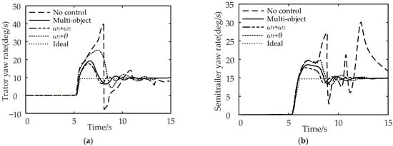 It can be seen from Figure 14a,b that compared with no control, multi-object control reduces the maximum yaw rate of the tractor by 45.45% and the maximum yaw rate of the semi-trailer by 4.55%; for , the maximum yaw rate of the tractor is reduced by 50.15%, and the maximum yaw rate of the semi-trailer is reduced by 6.82%; for , the control reduces the maximum yaw rate of the tractor by 40.91%, and the maximum yaw rate of the semi-trailer by 2.27%. In conclusion, compared with the no control strategy, the multi-object control and control can effectively reduce the maximum yaw rate of the tractor and semi-trailer.