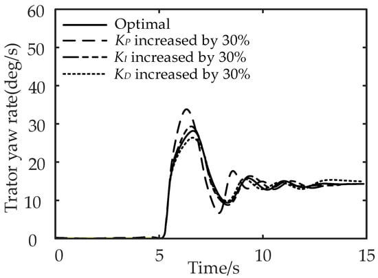 The robustness of control system means that the system has the ability to maintain a certain performance under the disturbance of uncertainty []. The proposed multi-objective PID control method is established based on the fuzzy PID control method, which has good stability and robustness []. To verify the robustness of the proposed control method, the tractor yaw rates under the step-steering-angle input working condition are compared when the control parameters , , and of the multi-object PID control method are increased by 30%. The other simulation parameters are the same with those in Section 5.2, and the comparison results are shown in Figure 20.