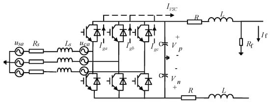 The voltage source converter is an important component of a DC microgrid. If a DC line fault occurs, it is propagated through the capacitor discharge, diode free conduction and power grid side-feed flow stages. Most HRFs are single-pole grounding faults; thus, one should focus on these faults. A schematic of the capacitor discharge stage is shown in Figure 1.