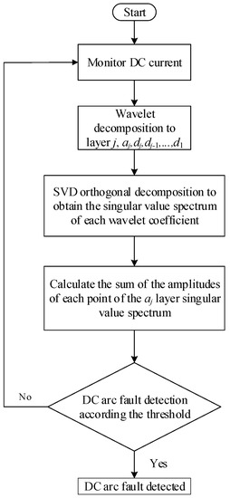 Based on the above, time–frequency domain detection method was used to extract the characteristics of arc HRFs. Orthogonal wavelet transformation and singular value decomposition (SVD) extract information in the time and frequency domains, respectively. After orthogonal wavelet transformation, the original signal is decomposed into various components at different scales when is a wavelet-based low-pass filter, is a wavelet based high-pass filter, is the low-frequency part of the signal, and is the high-frequency part of the signal. As the decomposition time increases, and are given by Equations (19) and (20), respectively: