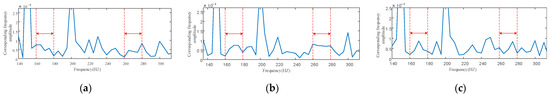 Amplitude frequencies of the normal and arc-resistance grounding fault currents: (a) Normal current amplitudes and frequency characteristics; (b) amplitude frequency characteristics when the inter-arc voltage was 160 V and the grounding resistance was 100 ohm; (c) amplitude frequency characteristics when the inter-arc voltage was 200 V and the grounding resistance 100 ohm.