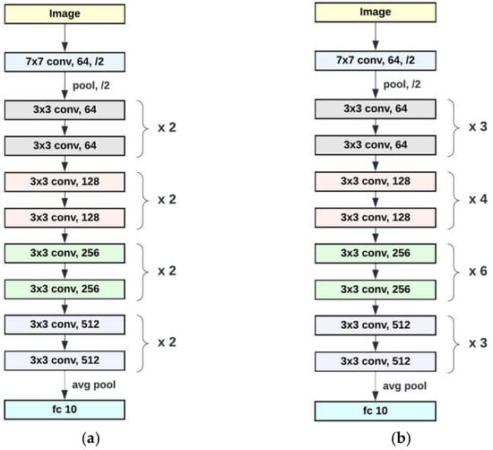 Block diagrams of (a) the 18 convolutional layer baseline; and (b) the 34 convolutional layer baseline models.