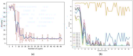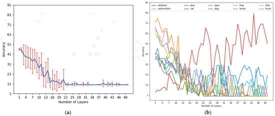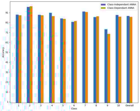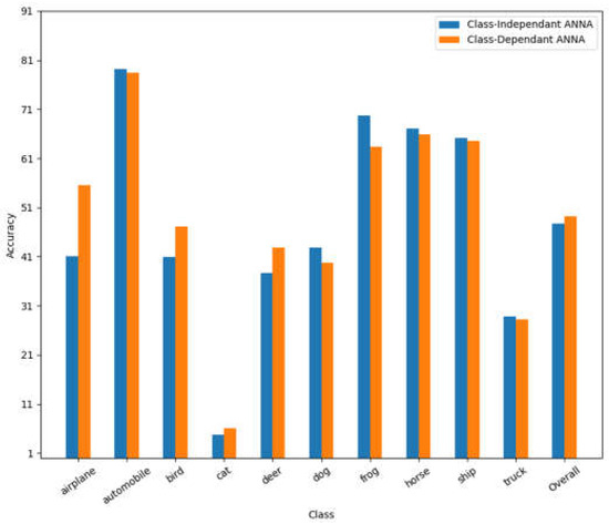 The overall accuracy and the per-class accuracies obtained using the class-independent and the class-dependent ANNAs when using CIFAR-10 dataset [43] are reported in Figure 13. As can be seen, the performance varies with respect to the image categories. For instance, the models achieved an accuracy of 10% and 30% for “cat” and “truck” classes, respectively, while attaining an accuracy of 79% for the “automobile” class. As mentioned in experiment 1, the accuracy obtained for class “cat” improves as the network depth increases. This explains the poor performance of the one hidden-layer network for class “cat”. This affected the overall accuracy of both ANNA approaches.