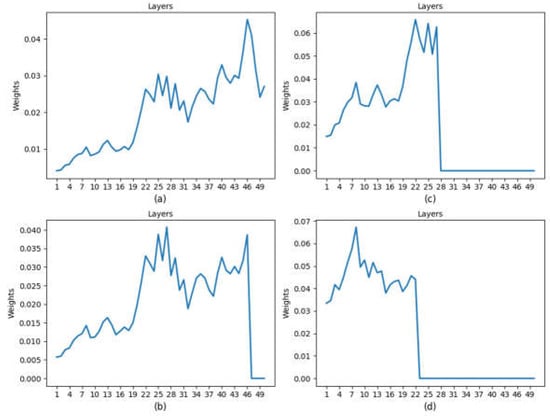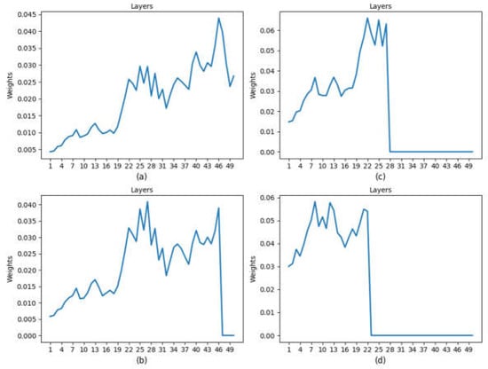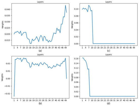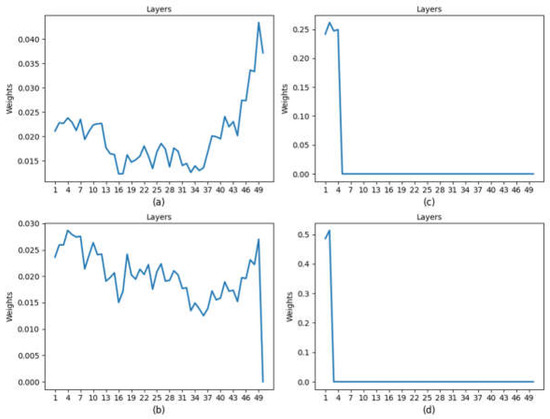 Layers’ relevance weights learned by the proposed class-independent ANNA on CIFAR-10 dataset after training the model using: (a) 1 batch; (b) 5 batches; (c) 6 batches; (d) 7 batches.