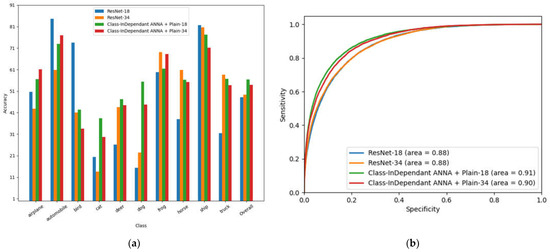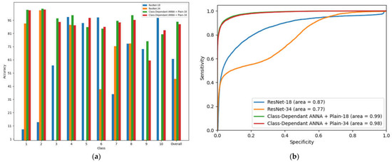 Figure 14a compares the per-class accuracies of ResNet models with class-dependent ANNA applied on plain-18 and plain-34. As can be seen, for categories “1”, “2”, and “3”, the class-dependent ANNA models outperformed ResNet-18 (and ResNet-34 for category “3”) by a significant margin. For the remaining categories, the class-dependent ANNA models presented a competitive or better performance than ResNet models. Figure 14b shows the receiver operating characteristic curve (ROC) for the ResNet models and class-dependent ANNA models. As exhibited by Figure 14, the proposed ANNAs approaches perform significantly better than ResNet models on the MNIST dataset [42].