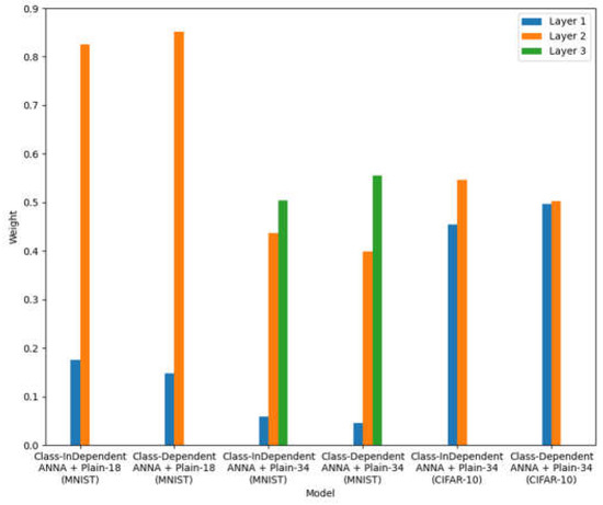 Layers’ relevance weights learned by ANNA approaches when applied to Plain-18 and Plain-34 on MNIST and CIFAR-10 datasets.