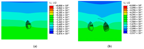 Figure 15 shows the vertical displacement of the surrounding rock at the target section in the two working conditions at the time of excavation to the target section. The influence of the two working conditions on the vertical displacement of the surrounding rock was the same. The vertical displacement of the two working conditions was relatively close because the rock mass parameters and excavation steps were consistent. The maximum vertical displacement of surrounding rock in Condition 1 and 2 was 2.631 and 2.620 cm, respectively. However, the comparison of the displacement at the tunnel vault shows that the blue area with the same value as Condition 1 had a smaller distribution range in Condition 2 and was separated from the vault by a layer of the light blue area. In other words, when the two working conditions were excavated to the same length, the vertical displacement of Condition 2 was smaller and was conducive to settlement control during construction.