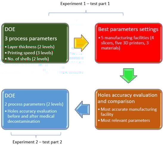 The results of the first experiment were used in the second one in which 3D-printed PLA test parts mimicking a surgical drill guide with inclined holes were manufactured. The dimensional accuracies of the guide’s holes before and after a post-processing process typical for the medical applications (i.e., decontamination by cleaning, washing and cold plasma sterilization) were compared. This experiment answered the following question: Are the accuracy and repeatability of the directly 3D-printed holes preserved after the medical decontamination process?