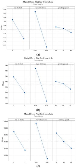 Main effect plots for the holes dimensional accuracy: (a) 10 mm holes; (b) 6 mm holes; (c) 8 mm holes.