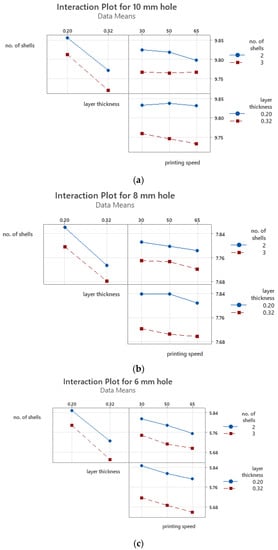 Interaction plots for the holes dimensional accuracy (a) 10 mm holes; (b) 8 mm holes; (c) 6 mm holes.