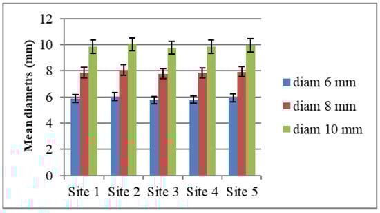 Using the best combination of parameters from the dimensional accuracy standpoint, three more prints were built in the manufacturing sites 2–5. Figure 6 presents a comparison between the mean diameter values obtained in the second stage of the experiment 1 (see also the Supplementary Material).