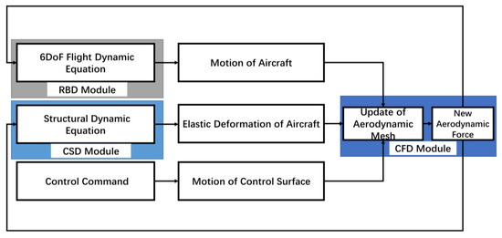 The multidisciplinary co-simulation in this paper is essentially a combination of two technologies—the CFD/CSD coupling computation technology and the numerical virtual flight simulation technology based on CFD/RBD coupling computation [22,23,24,25,26,27]. The CFD/CSD coupling calculation technology has been applicated in various aeroelastic mechanism research and engineering calculations. For example, the geometric nonlinear aeroelastic problems caused by large structural deformation were studied by CFD/CSD coupling technology with the updated Lagrange method [28]. As for the numerical virtual flight simulation technology based on CFD/RBD coupling, it is mainly used to simulate the dynamic process of aircraft in a specific period of time and to study various flight dynamics and control problems based on the simulation data. For example, by solving the unsteady Rans equation, rigid body dynamics equation and control law equation simultaneously, the simulation of the quasi-Cobra maneuver process of third-generation fighter aircraft was realized, and based on a similar simulation, the design of the control law of a missile was accomplished [29,30].
