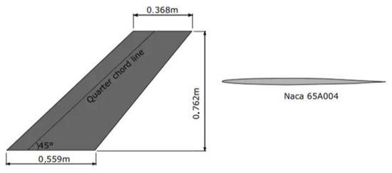 The main attributes of AGARD 445.6 are as follows: the mass of the model is 1.8628 kg, the aspect ratio is 1.6525, the root–tip ratio is 0.6576, the sweep Angle of the 1/4 string is 45°, the airfoil of each station along wingspan is NACA 65A004, and the experimental angle of attack (AOA) is set to zero.
