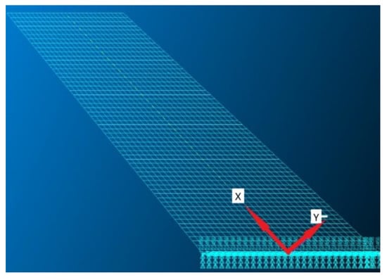 Based on the assumption of homogenization, the constructed structural model adopts three-dimensional Hex8-type grid elements, with 3080 elements and 4845 structural nodes. The material directions of the elements are divided into longitudinal and lateral directions, corresponding to the x and y axes of the local coordinate system in the figure, respectively. The material properties of the model are as Table 1:
