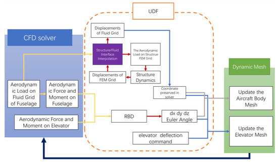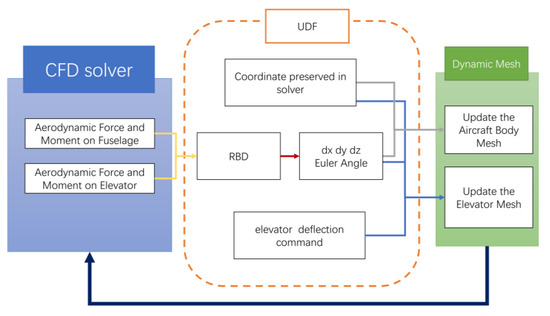 The procedure of co-simulation of CFD/CSD/RBD is shown in Figure 13. Firstly, the simulation program was initialized: the CFD/CSD interface interpolation matrix, the aircraft structure modal shape matrix, and the coordinates of the fluid node of the dynamic mesh of fuselage and elevator in the body reference frame in the initial state were stored in the CFD solver in the form of global variables.