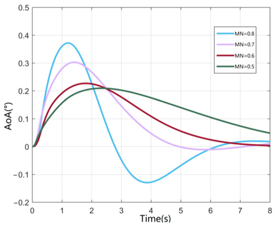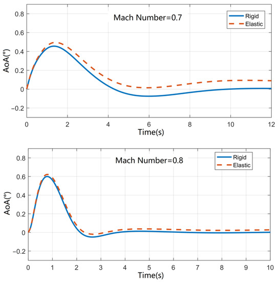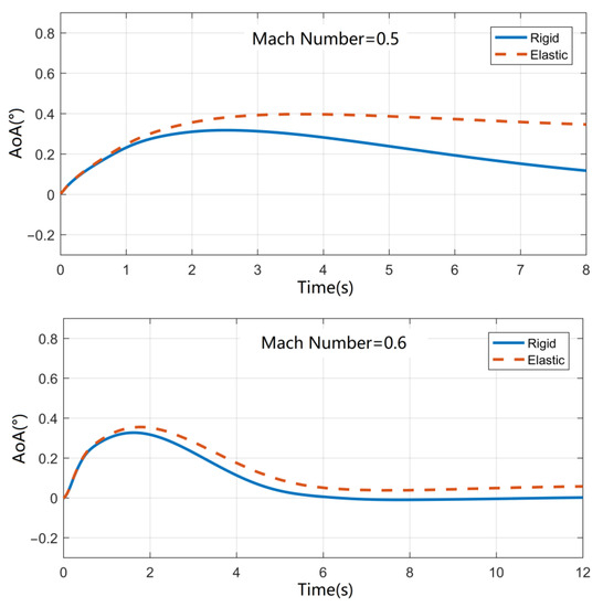 According to Figure 14, as the Mach number increases, the response curve of the angle of the attack shows an increasing natural frequency and decreasing damping ratio, which is in accordance with the general trend of aircraft dynamics characteristics with increasing Mach number. The red dotted line represents the response curve taking into account the elastic effect of the aircraft structure, while the solid blue line represents the corresponding response of the angle of attack without the elastic effect. From the calculation results under each Mach number, it can be seen that the elastic effect makes the response curve slightly lag behind the rigid body case in phase, which is due to a decrease in natural frequency, while the amplitude narrows significantly compared with the rigid body case, and the above trends are in line with those of the theoretical calculations in the literature. Additionally, the final steady-state angle of attack also increases slightly compared with the rigid body case, and the above trend becomes more significant with the decrease in Mach number.