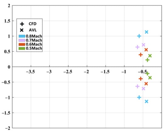 This paper verifies the validity of CFD/RBD coupling simulation by comparing the short-period poles that come from system identification based on RBD/CFD time domain simulation data with the short-period poles calculated by AVL’s nmode function. The time-domain simulation data involved in system identification include the AOA response curves to the elevator step input at four Mach numbers, as shown in Figure 9. The comparison of pole distribution is shown in Figure 10. It can be seen from the figure that the short-period pole distribution obtained by RBD/CFD co-simulation is similar to that obtained by AVL calculation, especially the natural frequency and the variation trend with Mach number are consistent, and there are only some errors in damping ratio.