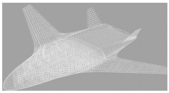 Firstly, the finite element modeling of the fuselage is introduced. The finite element model of the fuselage is shown in the figure, including structural elements such as fuselage skin, cabin lattice frame, wing ribs, wing beam and wing skin. The entire finite element model has nearly 3189 finite elements, which can represent more than 10,300 degrees of freedom. Three- or four-node curved plate elements are used to approximate the structure of the skin, beam, etc. Frames are represented by bending bar elements. The wing fin is represented by an axial rod element. As for the material properties of the element, the material is divided into spar material and skin material with reference to the literature [32], and the external skin and internal structure are, respectively, assigned two types of structural properties.