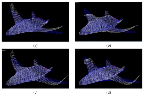 The mode shape of first four modes of HWB aircraft: (a) Mode 1, Freq = 1.15 Hz; (b) Mode 2, Freq = 1.58 Hz; (c) Mode 3, Freq = 4.22 Hz; (d) Mode 4, Freq = 4.75 Hz.