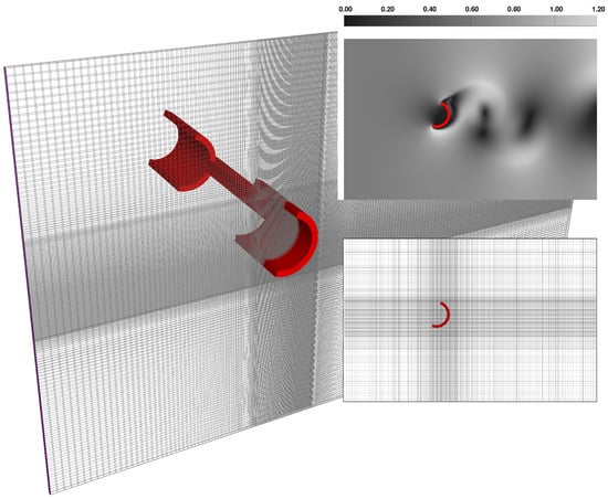 The CFD model is a commercially available package [32] solving for RANS on structured, non uniform grids. The C-shaped section of the VI wings has been placed in a steady, uniform water flow with its concave side facing upstream. The numerical experiments covered a range of flow velocity and AoA of and with increments of , , resulting in a total of 25 simulations. Although the model has been extensively benchmarked, a further validation was carried out: the reference drag coefficients of the two-dimensional semitubular cylinder of diameter mm at null AoA, as reported in [33,34], was calculated with a maximum error of 2%.
