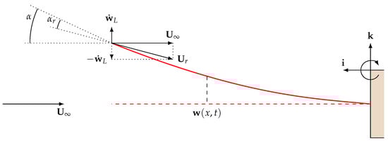 where and are the unit vectors, respectively, of the x and z axes as depicted in Figure 3. The evaluation of the force acting on the moving VI needs to account for its instantaneous AoA and velocity. Being the VI mounted on the tip of the oscillating beam, its instantaneous configuration can be described in terms of the motion and orientation of the tip. With reference to Figure 3, the quasi steady assumption is here enforced, which states that the force acting on the VI during its motion can be determined from the components of the static force in Equation (6) as: