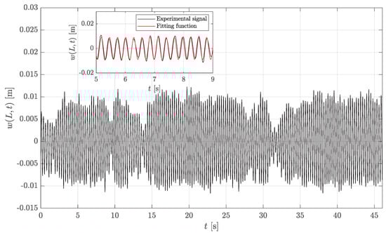 Experimental signal: transverse displacement of beam tip. The inset shows the overlapping of the harmonic fitting function with the experimental recording for the time interval 5 s < t < 9 s.