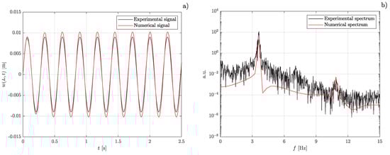 Comparison between experimental (black line) and numerical results (red line): time history of the tip motion (a) and frequency spectrum of the tip motion (b).