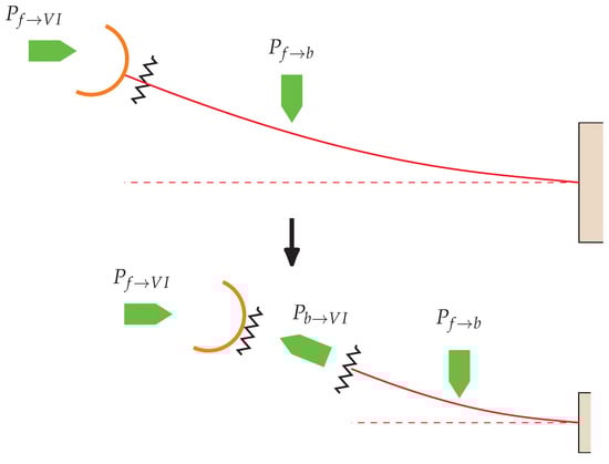By dividing Equation (17) by , the two terms on the RHS represent the power transferred to the VI by the beam and by the fluid, averaged over an integer number of periods. These two mean values of power, referred to as and respectively, must satisfy the following balance: