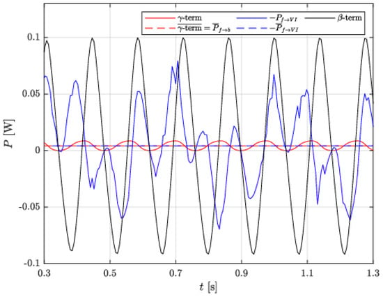 where the -term in Equation (14) does not contribute to the average since the product of the harmonic functions vanishes after integration. The time histories of these two contributions to the power are included in Figure 7.
