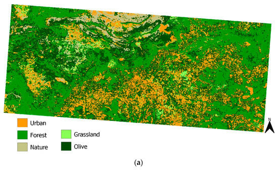 The baseline pipeline classified the input images into 5 classes: Urban, Forest, Nature, Grassland and Olive, while the two other ones assigned the pixels into Forest, Impervious, Olive and Non-olive classes. We observed significant visual changes between the map resulting from the one classification process and the ones resulting from the multi-classifier pipeline. We identified a significant decrease in the coverage of the olive class (represented in dark green on all land cover maps) in the multi-classifier pipeline’s map. This can be confirmed particularly in the West, Northwest, and North of the area of interest.
