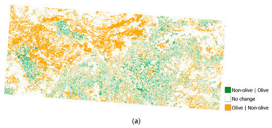 We can confirm that the area of Olive pixels changing to Non-olive pixels, which are represented in orange color, is emphasized in the area where we observed the significant decrease of olive coverage. Furthermore, we also observed that there are more pixels that turned into Non-olive class than into Olive class as orange coverage is broader than the green one. The change of these areas was calculated and results are presented in Table 3. The quantification of area in orange reached approximately 62.5 km2 and 42.9 km2 for the baseline-MLP and the baseline-OCSVM respectively. On the other hand, the area that changed from Non-olive to Olive in both subtractions is about 16 km2.