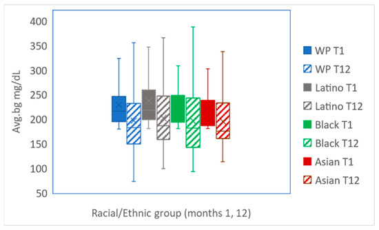 Average blood glucose levels (mg/dL) presentation by ethnic/racial groups. Avg.bg, the average blood glucose levels in T1 and T12 are presented per group: WP (p < 0.001), Latino (p < 0.001), Black (p < 0.001), and Asian (p < 0.005).