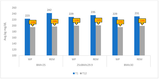 Average blood glucose levels (mg/dL) presentation by the WP and REM groups and BMI levels. WP, White persons; REM, people from racial and ethnic minority groups; Avg.bg, the average blood glucose levels; races/ethnicities as WP and REM (Latino, Black, and Asian); BMI groups <25 kg/m2; 25–29.9 kg/m2; ≥30 kg/m2; The change in average blood glucose from T1 to T12 is presented as a percentage.