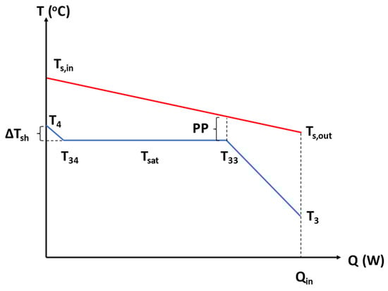 Through the heat recovery system, the thermal oil transfers heat to the organic medium. The heat recovery device consists of the economizer, the evaporator, and the superheater, where the fluid is converted to saturated liquid, saturated vapor, and superheated vapor, respectively. The pinch point (PP) in the inlet of the evaporator is assumed at 10 K [26] and the superheating (ΔΤsh) of 5 K [13] is considered. The heat recovery system modeling is illustrated in Figure 2. To make this diagram clear, it is important to state that T3, T33, and T34 are the organic medium temperature levels at the entrance of the economizer, evaporator, and superheater, respectively, while T4 is the temperature level when the organic fluid exits the superheater.