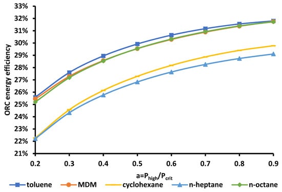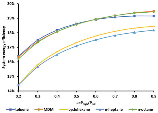 At first, the investigation is concentrated on the selection of the most proper working medium for the organic cycle. So, the ORC energy efficiency, the ORC electricity production, as well as the overall exergy efficiency are determined for different working fluids considering various ORC high-pressure values. The high pressure varies though changing the parameter (α) which is the ratio of the ORC high pressure to the critical pressure of the medium in a range from 0.2 to 0.9 [26]. The system exergy efficiency is defined taking into account that the electrolyzer is out of order, so the configuration operates as a power plant. According to the results that are illustrated in Figure 3, Figure 4 and Figure 5, in the cases of using MDM, toluene, or n-octane, greater values of the ORC energy efficiency, the ORC electricity production, and the exergy efficiency are achieved. However, the selection criterion has been decided to be the overall exergy performance. More specifically, the total maximum exergy efficiency is achieved utilizing MDM as the working fluid, while the parameter (α) is equal to 0.9. In this operation scenario, the ORC electricity production is equal to 24.776 kW, while the overall energy and exergy efficiency is determined at 18.15% and 19.49%, respectively. So, MDM is selected as the most proper working fluid for this case study. This fluid is an appropriate choice for the examined heat source temperature level. The most important parameters and outputs are presented in Table 4 and Table 5, respectively.