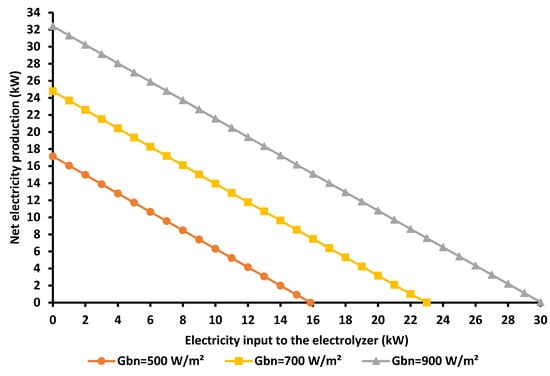 Net electricity production depending on the power input to the electrolyzer for different solar beam irradiation.