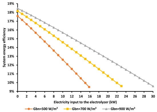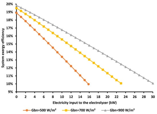 For the thermodynamic calculations, the parameters that are taken into account are the electricity input to the electrolyzer and the solar beam irradiation. When the default irradiation value of 700 W/m2 is considered, the PEM electrolyzer power input varies from 0 to 22.92 kW, which is the case when the whole ORC electricity production is used to power the PEM water electrolyzer and the hydrogen compressor, so there is no net electricity generation. Consequently, the main plant outputs, which are the net electricity production, the overall system energy, and exergy efficiency, are included in this section, depending on the electrolyzer power input and the solar beam irradiation. As it is shown in Figure 6, the net electricity generation has a linear decreasing rate depending on the electricity input to the electrolyzer. The maximum value is equal to 17.15 kW when solar beam irradiation is equal to 500 W/m2, 24.78 kW when this value is equal to 700 W/m2, and 32.40 kW when this value is equal to 900 W/m2. These are the cases of zero hydrogen production and compression, while the minimum values are equal to zero when the installation does not provide electricity and the entire power is utilized for hydrogen production and compression. In Figure 7 and Figure 8, it is illustrated that both energy and exergy efficiency decrease when the electricity feeds to the PEM water electrolyzer, and the hydrogen production rate increase. When the plant provides only electricity to the grid, the energy and exergy efficiency are determined at 18.46% and 19.83%, respectively, in the case of the solar beam irradiation that is equal to 900 W/m2. However, in the case of maximum hydrogen generation, these rates are equal to 9.6% and 10.07%, respectively. Finally, according to the results, the net power production, as well as the overall energy and exergy efficiencies increase with the increase of solar beam irradiation. The calculated values of both energy and exergy efficiency are greater than the corresponding ones defined by Atiz et al. [19]. The authors of this study investigated a similar system that is based on the PTC-powered ORC, as well as provides electricity and hydrogen, leading to an energy efficiency of 5.85%, and an exergy efficiency of 8.27%. In the present work, it is assumed that both the pump and turbine achieve high isentropic efficiency, enhancing the overall ORC performance.