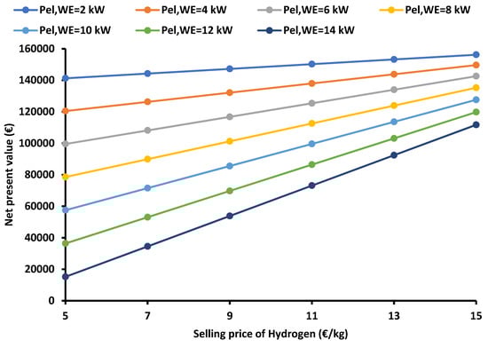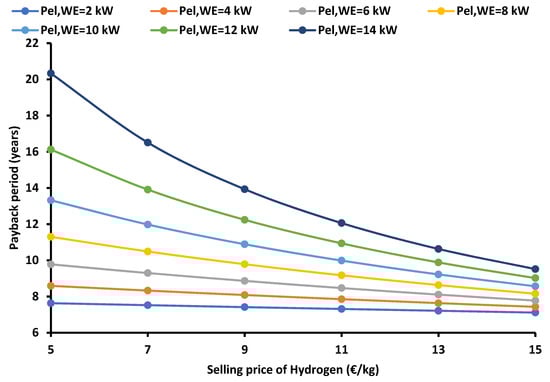 In the previous equation, () is the yearly electricity production in kWh, () is the yearly hydrogen generation in kg, and () is the selling cost of hydrogen in €/kg. Furthermore, the simple payback period (SPBP) is calculated as: