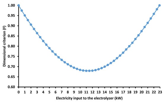 At first, the analysis is focused on the organic working fluid selection based on the ORC exergy efficiency. Furthermore, a parametric analysis is performed and split into two sections, the thermodynamic and the financial one. The examined thermodynamic parameters are the share of ORC electricity production that powers the PEM water electrolyzer, as well as the solar beam irradiation value, which varies from 500 to 900 W/m2, with a step that is equal to 200 W/m2. The main financial parameter is the selling price of hydrogen, which varies from 5 to 15 €/kg [38]. After the parametric analysis, it is essential to define a final system design through a simple optimization process. To carry out this analysis, a dimensional criterion is considered, which includes two thermodynamic objectives, i.e., the maximum overall system exergy efficiency and the maximum hydrogen production. Through this criterion, a design case that produces a significant amount of hydrogen without a sizeable reduction in the exergy performance is determined. According to the criterion, the selected final point is the one that is closest to the ideal point, where the two objectives are optimized at the same time. For this case, the dimensional criterion (F) is expressed by the following equation [26]: