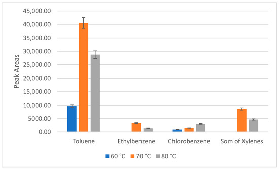 As the next parameter, the sampling temperature was examined. The enhanced temperature could increase the distribution of VOCs between a sample and the headspace because higher temperatures cause higher vapor pressure of the analyte, and consequently, its concentration in the headspace increases [28]. According to the literature, the usually applied HS sampling temperature for the BETX sampling from water samples is between 70 and 80 °C [31,32,33]. Therefore, for the selection of the sampling temperature, the sample was exposed for 20 min to temperatures ranging from 60 to 80 °C. HS sampling at the laboratory temperature was also tested, but the extracted analyte concentration was below the limit of detection. It was observed that the quantity of the extracted compounds increases with the temperature (Figure 1). Headspace sampling at 80 °C also caused lower peak resolution than at 70 °C, which complicated the identification of the analytes. At higher temperatures, a higher amount of water may be injected into the GC system, which could cause an increase in the background level [32]. Therefore, to reduce water vapor, 70 °C was preferred as the optimum sampling temperature.