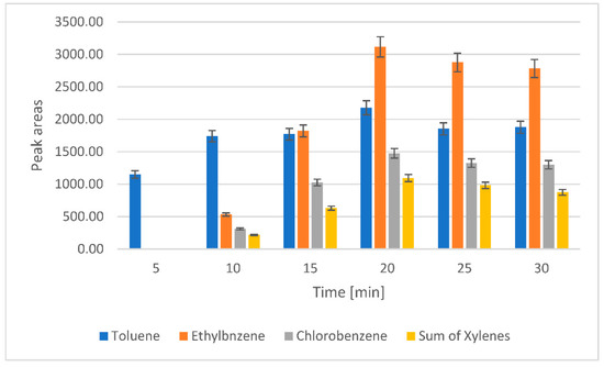 The effect of sampling time on the efficiency of toluene, ethylbenzene, chlorobenzene, and xylene transfer to the gas phase. The dependence of the peak areas on the sampling time.