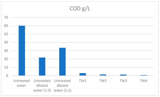 Two dilution ratios (1:1 and 1:3) of industrial wastewater and two different working electric currents (20 A and 30 A) were tested. As a result, four different types of treated wastewater were obtained. In all cases, the COD values were rapidly reduced; however, lower values were obtained when the dilution ratio was 1:3 (V:V) for working electric current 20 A and 30 A, respectively. The reduction in CODs is shown in Figure 3. The COD was reduced by between 95% and 99% in both systems. The reduction in the COD values reflects that the system worked with a higher working electric current, 30 A, which was more advantageous because the COD values have been reduced from 60 g/L to 0.63 g/L. The COD values of the untreated diluted effluents were evaluated. The COD has been reduced thanks to the dilution into the values of 21.8 g/L and 33.5 g/L for dilution ratio 1:3 (wastewater:deionized water, V:V) and 1:1 (wastewater:deionized water, V:V), respectively.