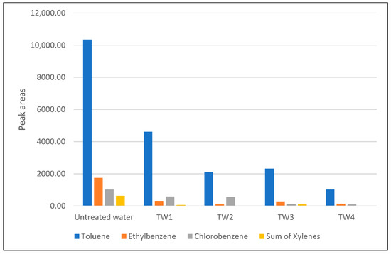 Dependence of the peak areas of studied VOCs on different treatment processes (TW 1—TW 4—treated water samples under the treatment conditions noted in Table 3).