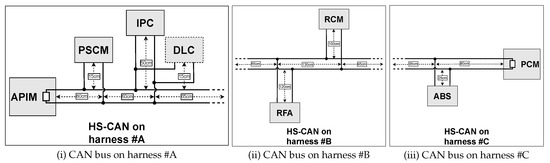 In our work, we use three wiring harnesses that have multiple connectors from which we preserved 8, i.e., 7 for the ECUs and 1 for the DLC. The wiring network diagram schematic view including the ECUs, the main bus wiring and the connection stubs is shown in Figure 3. The wire and stub lengths are shown in Figure 4i–iii for the CAN bus defined by wiring harnesses #A, #B and #C.