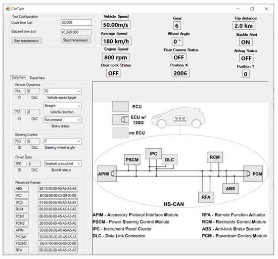 After the model was generated as C code, we integrated it in the embedded project from AURIX studio that we configured for the Infineon AURIX TC275 microcontroller. As model execution steps inside the software project we start with the initialization functions, i.e., in order to initialize the local variables and data structures according to the model settings. Then, we execute the model step function every 20 milliseconds to consume the input data received from CAN bus, i.e., from the tool or from other models. After executing the step function, the outputs from the model are transmitted as CAN bus signals that can be split into multiple CAN frames depending on the content. The ABS twin computes the valve status and slip for each wheel (front left, front right, rear left, rear right) and transmits the calculated vehicle speed on CAN based on the braking status information. The powertrain twin computes the vehicle acceleration, engine torque, etc., and transmits the engine speed and gear position on the bus. The power-steering twin computes and provides the steering offset of the vehicle considering the steering wheel angle value and also sends the X and Y position relative to the vehicle starting point. The restraint control module provides the airbag status, taking into account the buckle status received from the vehicle bus. The instrument panel cluster provides as outputs on the CAN bus the average vehicle speed and trip distance based on the received vehicle speed values and the buckle alert using the buckle status from the CAN tool frame. The remote function actuator modifies and transmits the door lock status, taking into account if the door lock button is pressed using a debounce time of 1 s. The accessory protocol interface module will activate the rear-view camera if the vehicle is driven backwards and will constantly provide the rear-camera video status on the vehicle bus. CAN output signal information that includes bit size transmitted by each ECU model from the CarTwin setup is shown in the second part of Table 1, while the first part of the table details the signals transmitted from the C# tool.