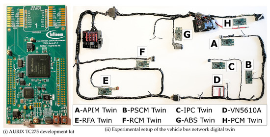 In order to use the CAN network from the vehicle wiring harness, we cut the CAN wires before the original vehicle connectors and soldered 2.54 mm headers on them. The headers were connected to the 2.54 mm male connectors, which were available on each development board as a CAN bus connector. The experimental setup that contains the in-vehicle ECU models and the VN5610A connected to the wiring harness is shown in Figure 13ii.