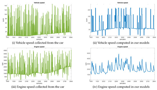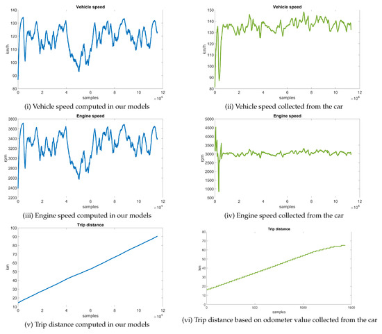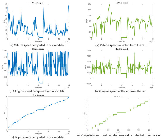 Local roads. In Figure 15, we show the signals while the vehicle is driven in the city and on local roads. The plots from the left side are the outputs from our simulation, i.e., Figure 15i,iii,v, while the plots from the right side are the signals collected from the real car, i.e., Figure 15ii,iv,vi. For the vehicle speed signal, the model output varies between 0 km/h and 85 km/h, while the vehicle speed signal collected from the vehicle varies between 0 km/h to 80 km/h (with the exception of one spike to 120 km/h during a car overtake in the real scenario). Engine speed varies between 800 rpm and 2500 rpm in the model output, while in the vehicle trace, the signal value is of 900 rpm to 2500 rpm (except for a few spikes at 4500 rpm). We have a different number of samples for the trip distance (between our simulation and the signal collected from the car) because our model runs at 20 ms, while the car CAN bus message that contains the odometer is transmitted every 1 s. However, the trip distance signal has a similar variation over time.