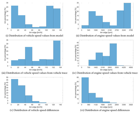 Statistical comparison. As an additional metric for the accuracy of the model outputs, we compute the mean values for the differences between the output signals of the model and those from the vehicle trace and the correlation coefficient between these signals. To provide a comprehensive evaluation for the computed mean difference, we show several plots with the distribution of vehicle speed and engine speed signals from the model output, vehicle trace and the difference between them. The distribution of the vehicle speed from the model is shown in Figure 17i, with more than 20% of values in each of the following ranges: 0–20 km/h, 100–120 km/h and 120–140 km/h. The distribution of the engine speed from the model is shown in Figure 17ii, with 30% of the values in the 3240–3780 rpm range and more than 20% of the values in the 540–1080 rpm and 2700–3240 rpm ranges. The vehicle speed from the vehicle trace has more than 30% of the values in the 132–154 km/h range while driving on the highway and around 25% of values in the 44–66 km/h range while driving on local roads, as shown in Figure 17iii. The engine speed was in the 2800–3500 rpm range for more than 40% of occurrences in the vehicle trace and around 25% within the 1400–2100 rpm range, as illustrated in Figure 17iv. The distribution for the vehicle speed difference is shown in Figure 17v, with 46% of values in the 0–20 km/h range and 80% of values in the 0–40 km/h range, while the distribution for the engine speed difference is shown in Figure 17vi, with 60% of values in the 0–560 rpm range and 83% of values in the 0–1120 rpm range. Numerical data, which contains the bin width and the bin percentages for each of the seven bins from the distributions, is presented in Table 2.